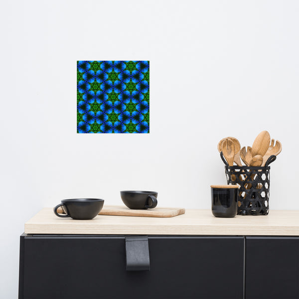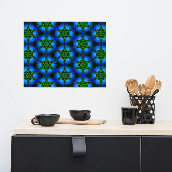 This poster has a partly glossy, partly matte finish and it'll add a touch of sophistication to any room. Stunning blue colors surrounding green kaleidoscope and will be an attention getter, whether in your home or on office walls!